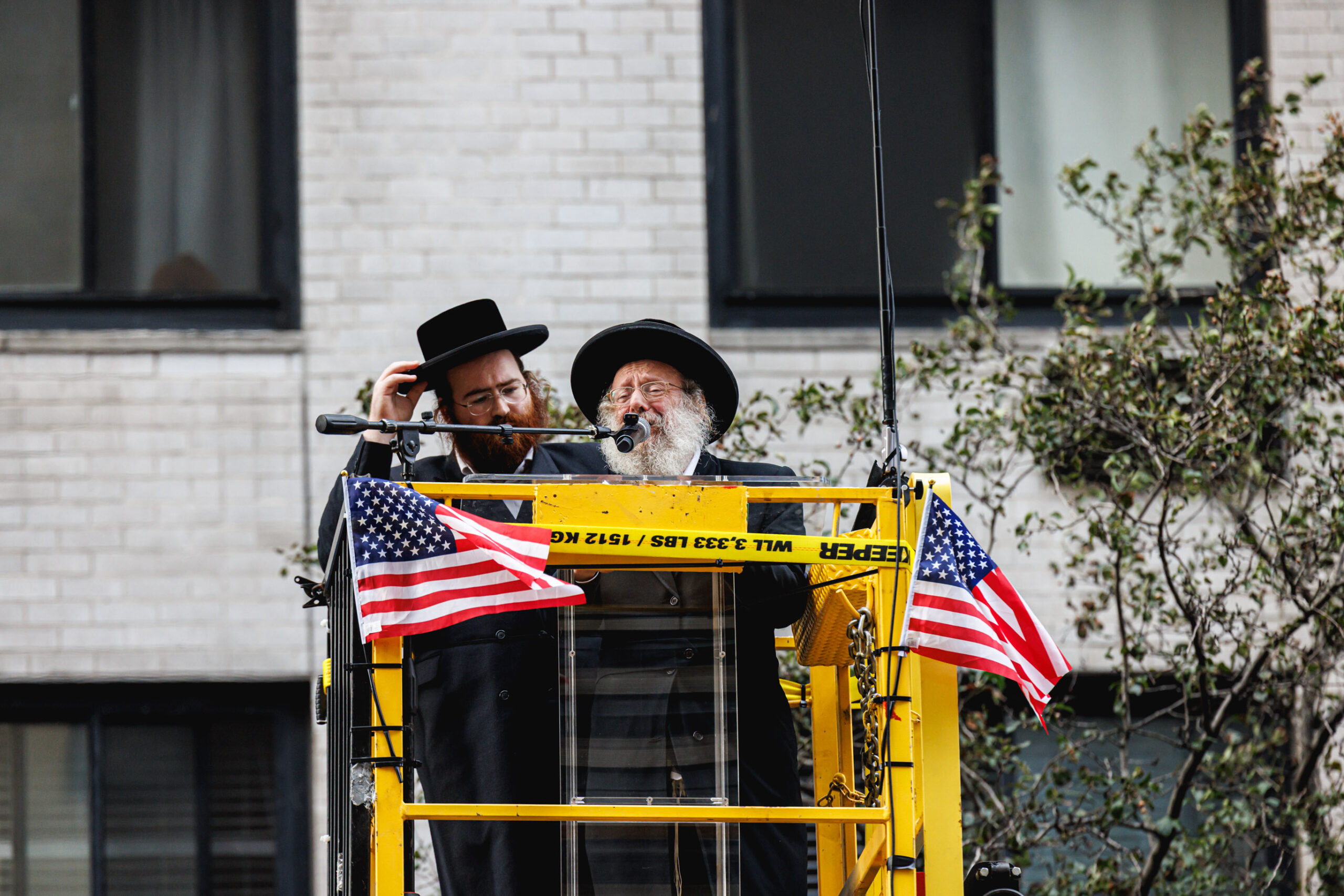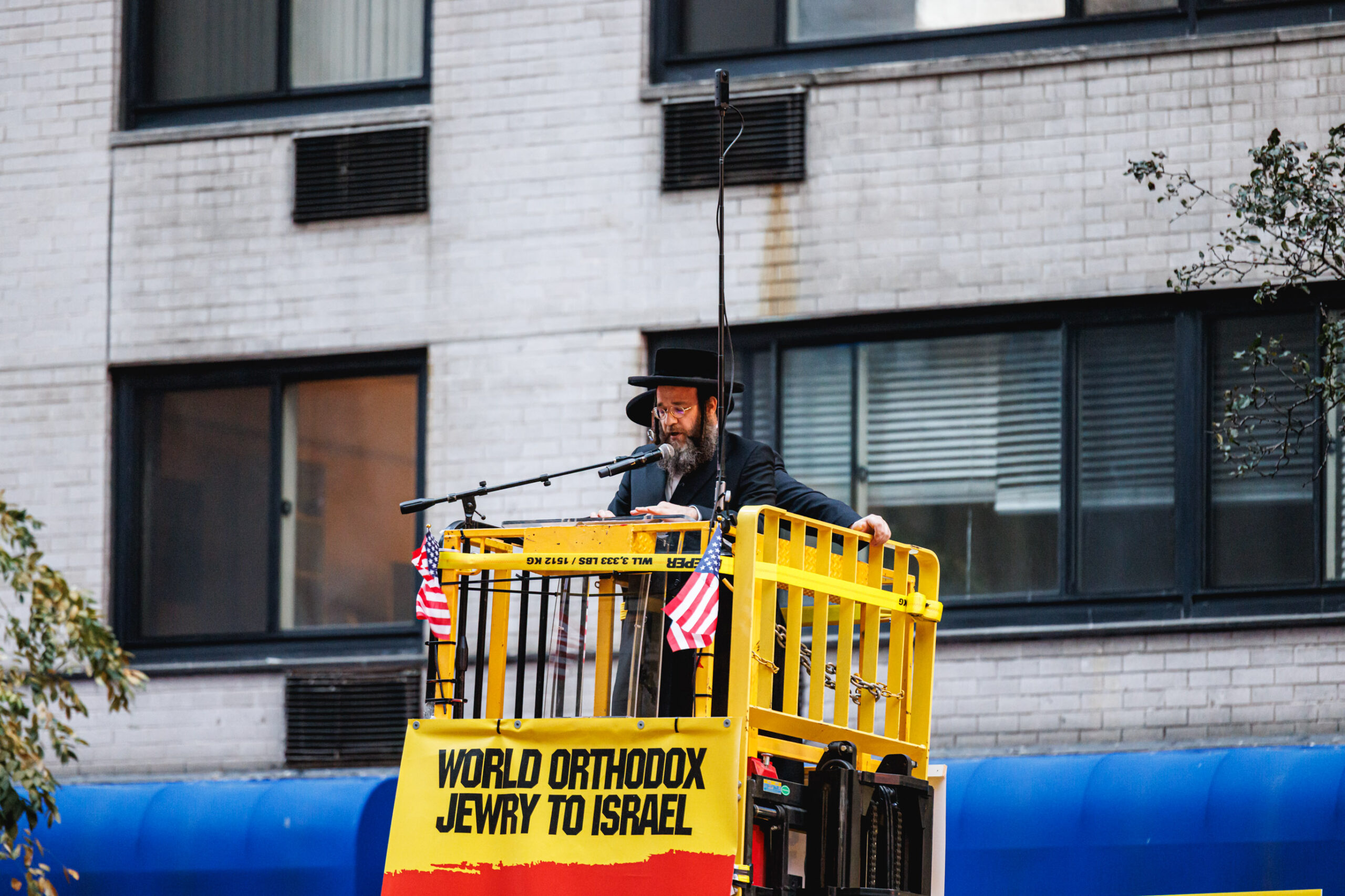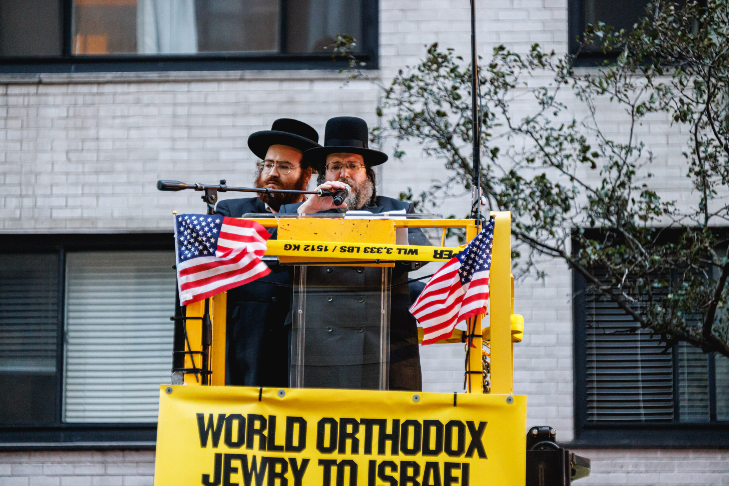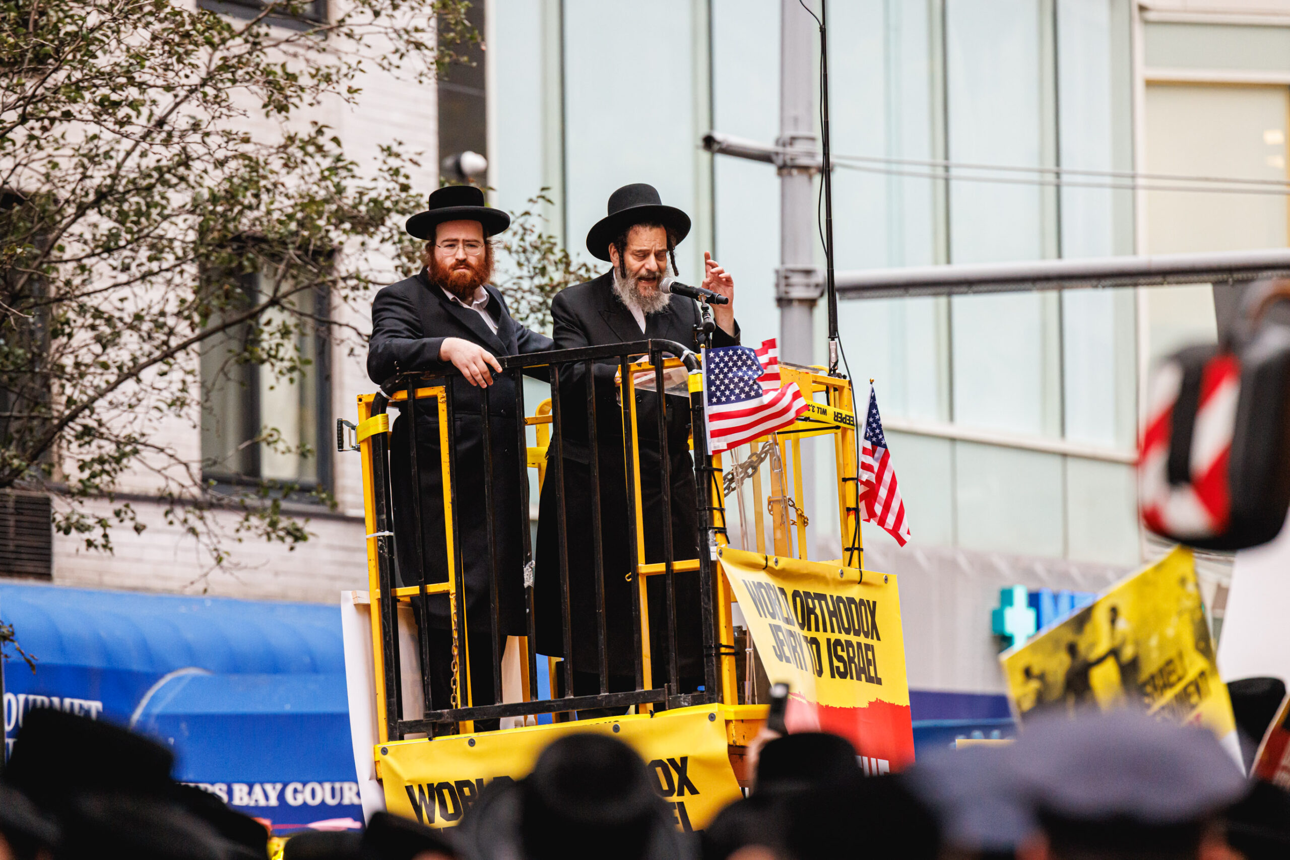 בשל התנאים לקיום ההפגנה, לא הוצבה במה גדולה, אלא למקום הובא מנוף שהרים בזה אחר זה את הרבנים וראשי הישיבות שנשאו את הנאומים. את האירוע פתח דברי פתיחה נשא, הרה”ג יהושע נחמן בערגער ראש ישיבת ‘אהל תורה’, מבורו פארק. ואחריו עלה הרה”ג דוד הירשלר מירושלים, שהיה נציג ארץ ישראל. בהמשך נשאו דברים: הרה”ג אנשיל אשכנזי, אבד”ק ‘חוות דעת’. הגה”ר יעקב הורוביץ, ראש ישיבת ‘בית מאיר’. הרה”ג שלמה שבתי קסטנבוים, דומ”ץ בביהמ”ד ‘בנין בראך’ דקהל ‘ייטב לב’ סאטמר. העצרת ננעלה עם קבלת עול מלכות שמים, שבה התכבד כ”ק האדמו”ר מבאבוב.