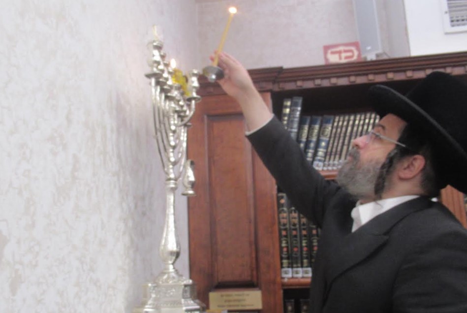 הסופר החרדי ר' דוד מרדכי דמן התכבד להדליק נרות חנוכה בביהמ"ד אהל משה דחסידי בעלזא באנטווערפן.